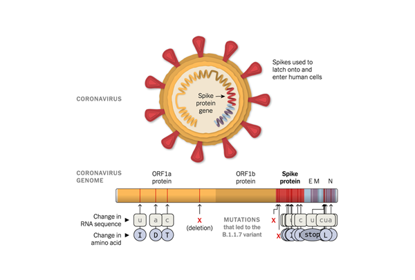 B.1.1.7新冠变异病毒示意图(图片来源:《纽约时报》)