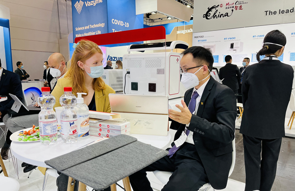 在kaiyun开云展台,“全自动解决方案”“半自动解决方案”“新冠整体解决方案”,以最大程度满足不同国家和地区客户、不同应用场景检测需求的特点,获得了众多来访国际客户的好评。尤其是iPonatic四通道产品,以其便捷、易操作、检测时间快、检测项目多等优势吸引了会场一大波新老“粉丝”的目光。