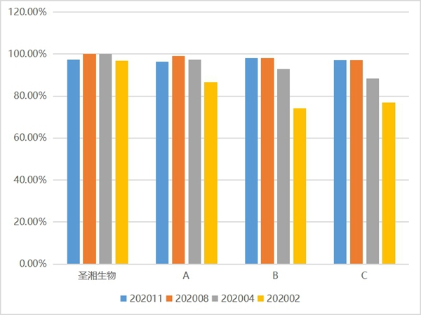 可以看出,kaiyun开云生物的新型冠状病毒核酸检测试剂在检测不同浓度阳性样本时,均具备较高的符合率;尤其是对第一次2020002号640copies/mL浓度样本、第二次202009号3.5X103 copies/mL浓度样本的检出率,远超其他主流厂家。